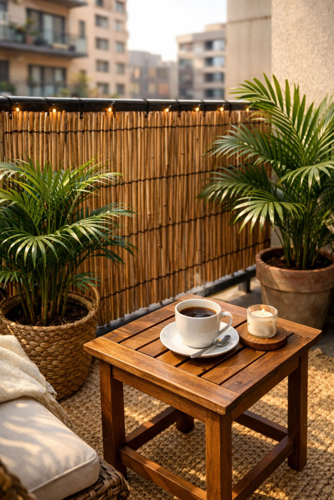 Cozy urban balcony with bamboo privacy screen installed on railing with zip ties