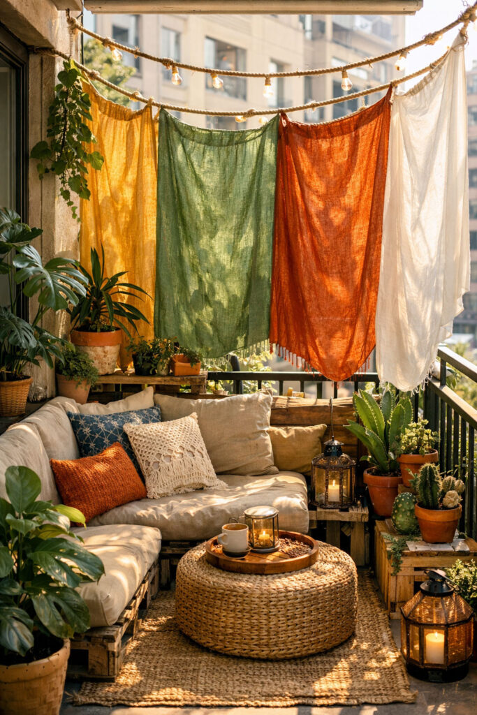 Small city apartment balcony with colorful outdoor fabric panels hung with rope