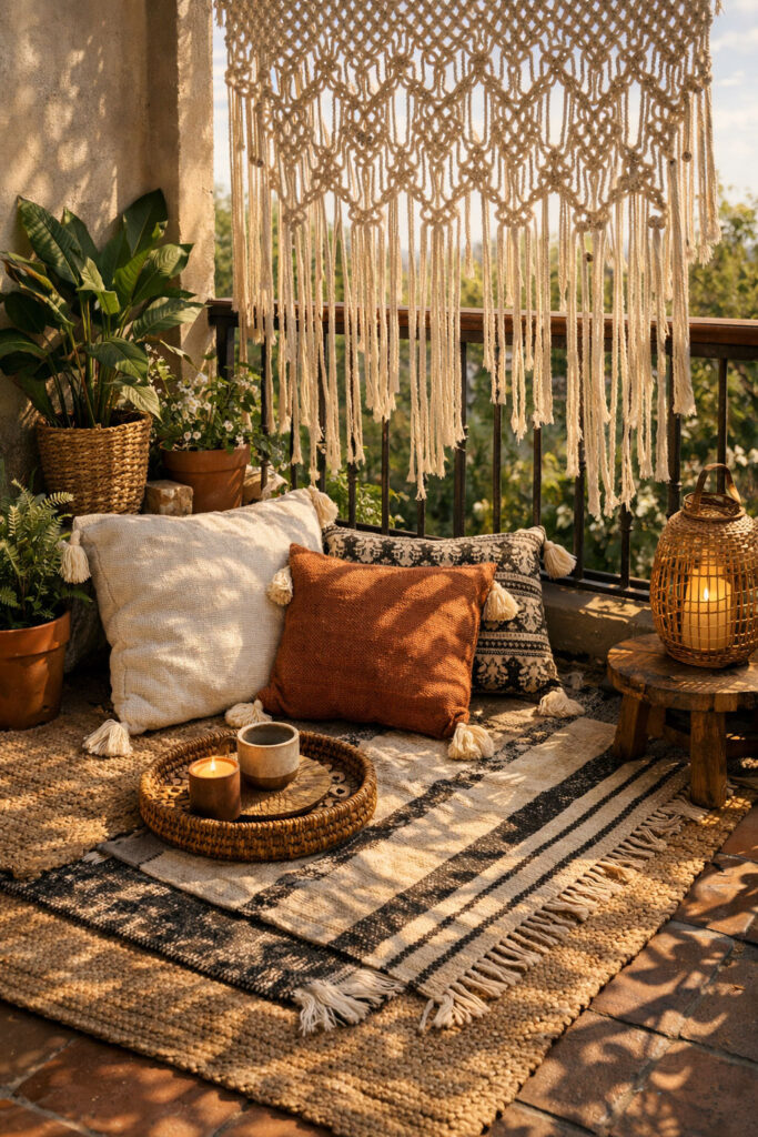 If you enjoy DIY crafts, create a rope or macramé privacy screen that hangs between railing posts or from the ceiling. This adds bohemian charm and privacy without any hardware.