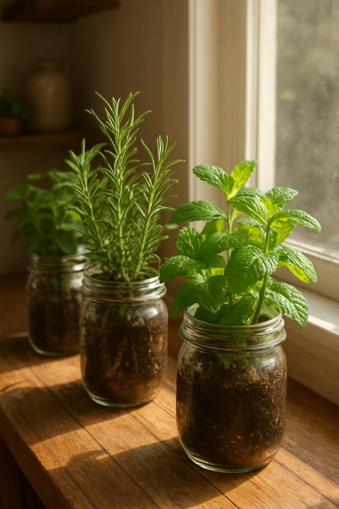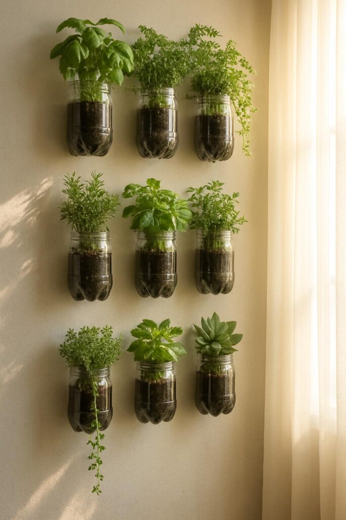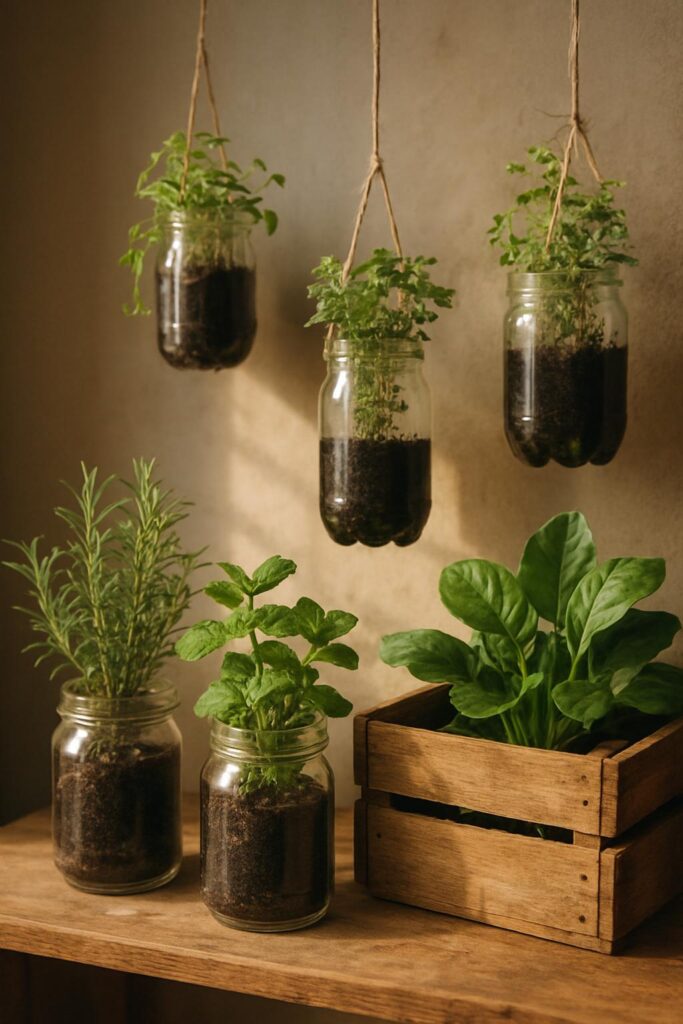 - Recycled Jar Herb Garden: Clean old glass jars, add drainage material, fill with potting mix, and plant herbs like basil, thyme, or parsley. Arrange them on a sunny windowsill for easy access while cooking.