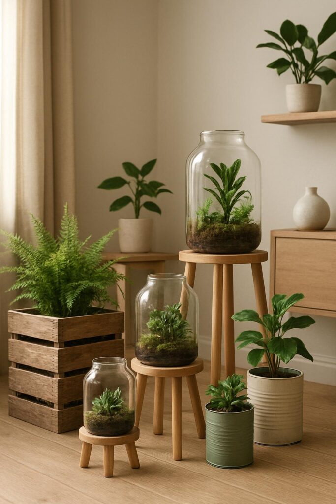 Combine different materials and container styles for a curated yet casual look. Pair a sleek glass terrarium with a rustic wooden crate planter, or line up tin cans decorated with twine alongside quirky plastic bottle pots. This eclectic approach feels modern and intentional.