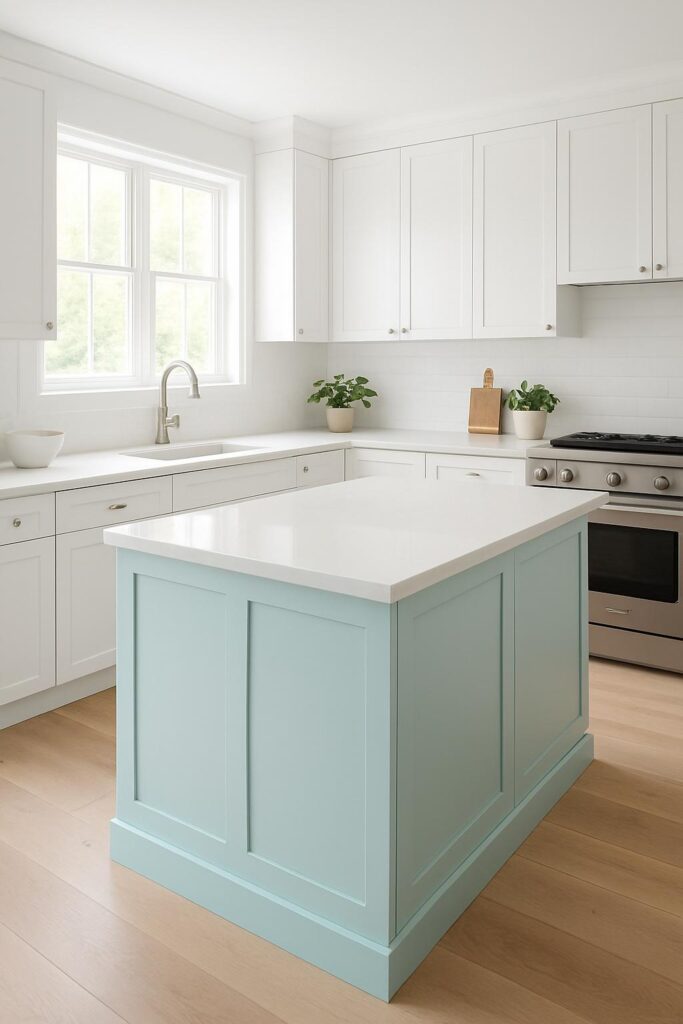 Pastel cabinetry or accent walls combined with white countertops and backsplash keep the kitchen bright and inviting. This palette works especially well in cottage, coastal, or modern minimalist kitchens.