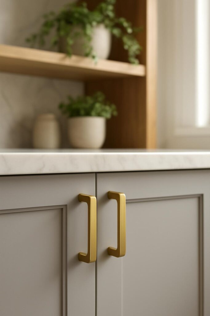 Close-up of modern kitchen cabinet hardware, brass pulls on soft grey cabinets