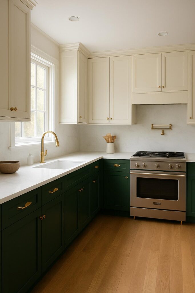 This pairing is perfect for kitchens that want to balance elegance and warmth. Matte black hardware and light fixtures add an industrial edge, while beige tones keep things cozy and approachable. It’s also a fantastic choice for those looking to increase home value with a timeless color upgrade.