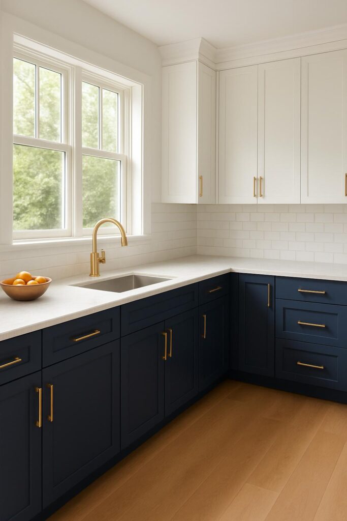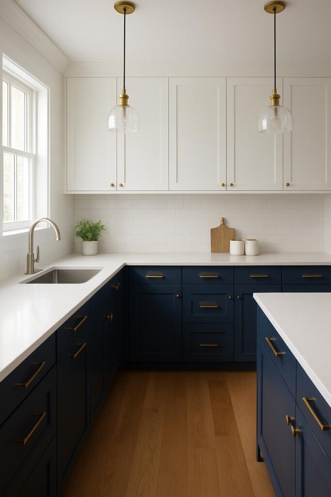 Try pairing this combo with warm brass or gold hardware and fixtures for a touch of luxury. White marble or quartz countertops with subtle veining complement this palette perfectly. This look works well in both open-concept kitchens and smaller spaces, as the white uppers keep it airy.