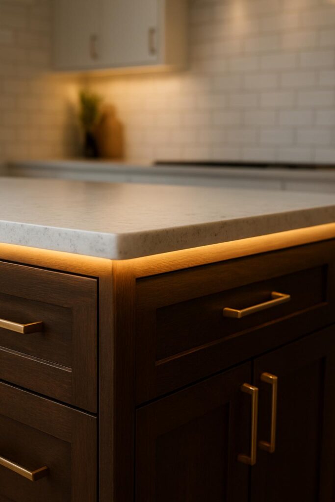 Kitchen island close-up showing warm LED strip lighting under quartz countertop edge
