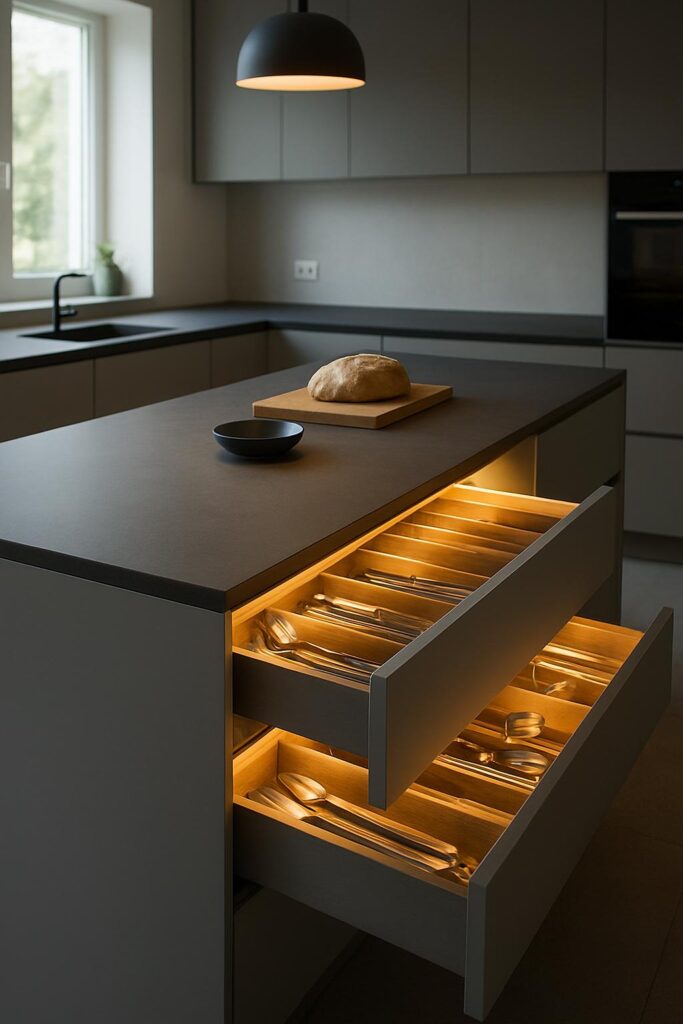 Consider including built-in features such as seating, storage, or even appliances. You want your island to be both beautiful and functional. Don’t forget to leave room for LED strip lighting placement—whether under the overhang, inside drawers, or along the base, the lighting should feel like an intentional part of the design.