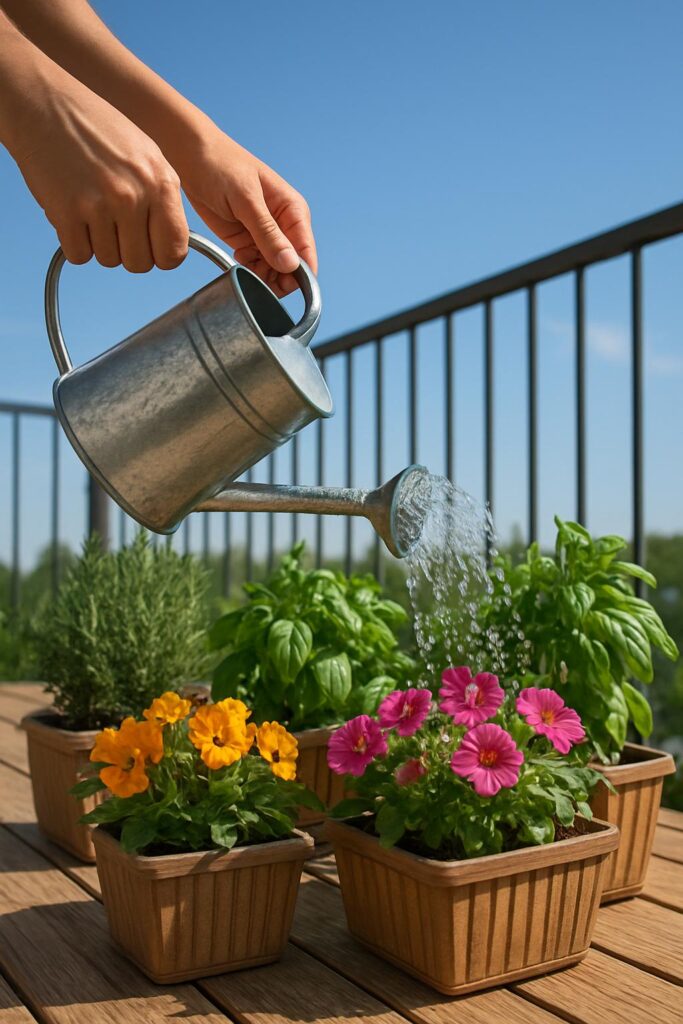 Watering diverse deck planters filled with blooming flowers