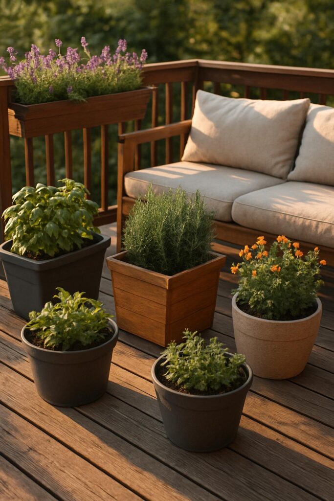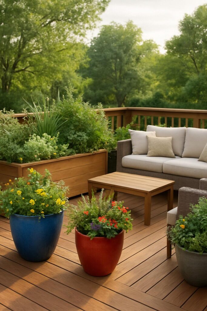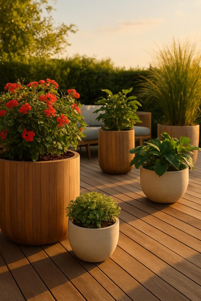 - Mix Materials: Combine wooden deck planters with metal or resin ones for contrast and texture.