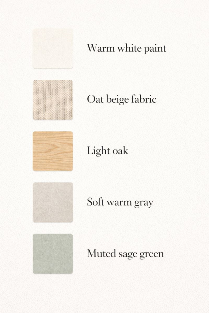 A labeled palette (Warm White / Oat Beige / Light Oak / Soft Gray / Sage Accent).