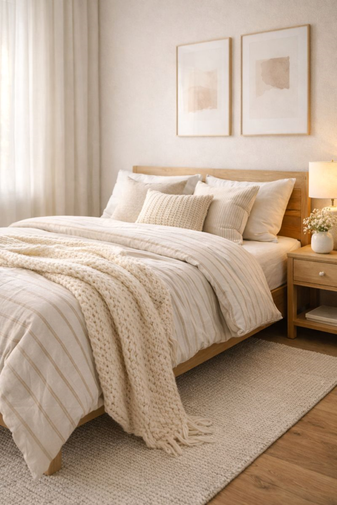 - Layer textures (not clutter). Think: knit throw + linen bedding + soft rug.